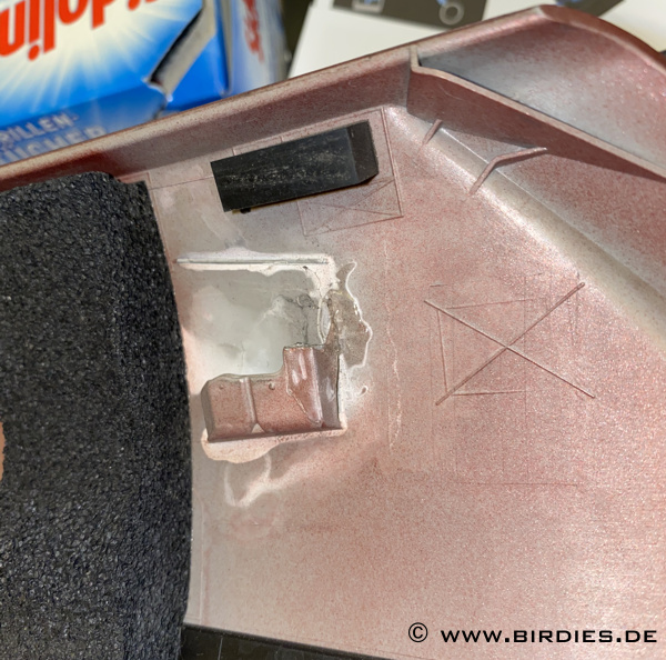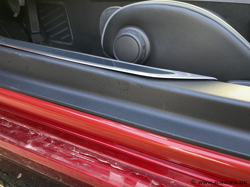 Leider fiel mir nicht sofort auf, dass die neuen Leisten nun zwar "oben" richtig verklebt waren, jedoch den selben Montagefehler an der Innenseite des Holms hatten, was ich schmerzhaft bei der Reinigung des Innenraums einige Monate später feststellen durfte.