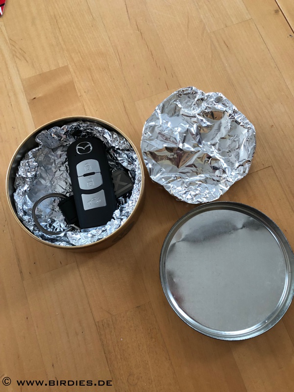 Mit meinem physikalischen Wissen dachte ich mir also es handelt sich um Funk, und angeblich soll einfach Alufolie, die man mehrfach um den Schlüssel wickelt helfen, also sollte eine Blechdose das auch tun.