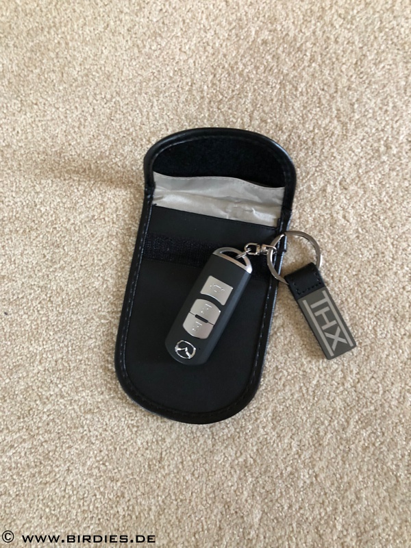 Letztendlich habe ich dann doch bei Amazon eine günstiges Schlüsseltaschenset erstanden, dass tatsächlich zu funktionieren scheint. Jedenfalls blockt es das Signal genug ab, dass sich das Fahrzeug nicht mehr öffnen lässt.