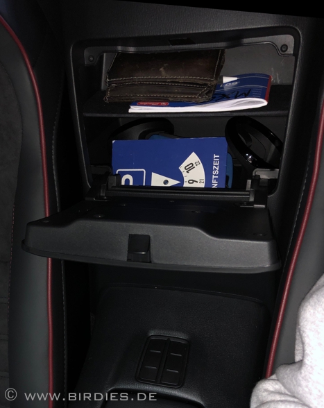 "Ablagen". Das Minifach an der Mittelarmlehne fasst gerade so ein