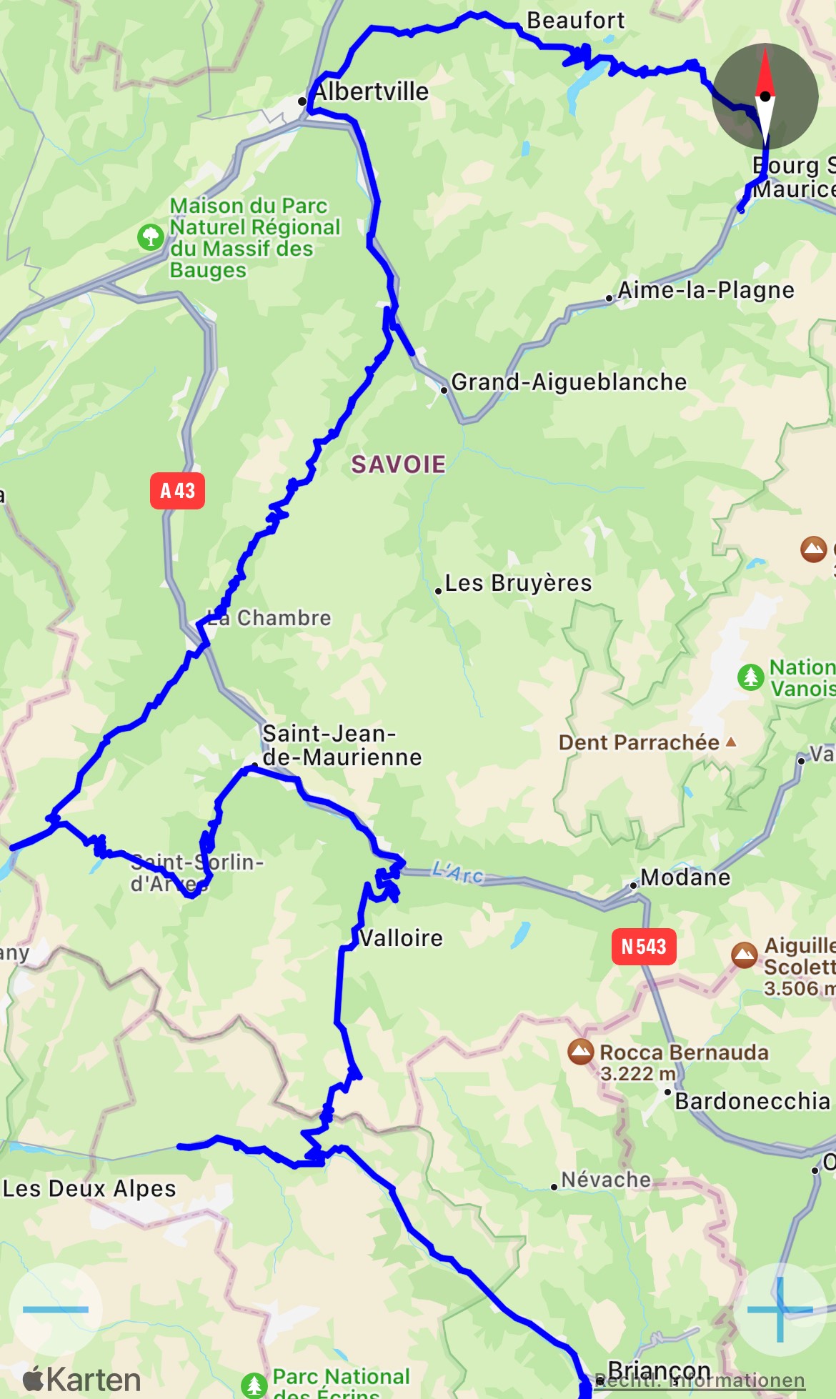 Statt wie geplant über den Col du Lautaret über Le Bourg d'Oisans zum Col de la Croix de Fer zu fahren, mussten wir erneut über den Gabilier und Telegraphe fahren und hatten so am Ende insgesamt beeindruckende SIEBEN Pässe statt geplanter drei Pässe hinter uns gebracht.