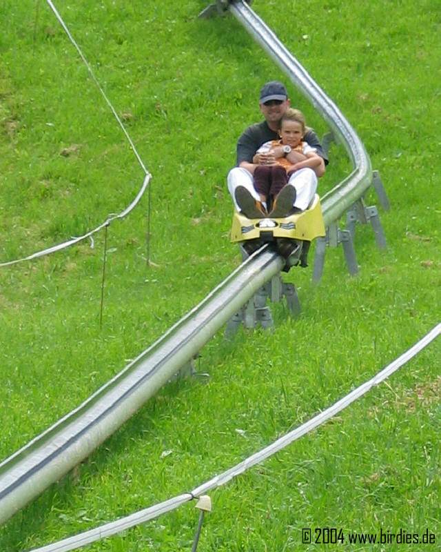 beachtlichen Geschwindigkeiten auf der Rodelbahn wieder nach unten ging.