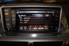Am Lenkrad sind natürlich nur die nötigsten Funktionen, Vor/Zurück und Lauter/Leiser, vorhanden. Dagegen ist am Navi ein Menü, vergleichbar dem echten iPod-Menü, erreichbar. Es stehen also die üblichen Kategorien und Wiedergabelisten zur Verfügung. Das schnelle Scrollen durch größere Listen geht aber bei weitem nicht so komfortabel, wie mit dem Click-Wheel. Alles ein kleines bisschen zu langsam um flüssig zu wirken.